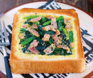 4枚になったベーコンを、食パンと角度を変えて正方形に置く。(卵を割り入れるので、真ん中を少し空けておく。)