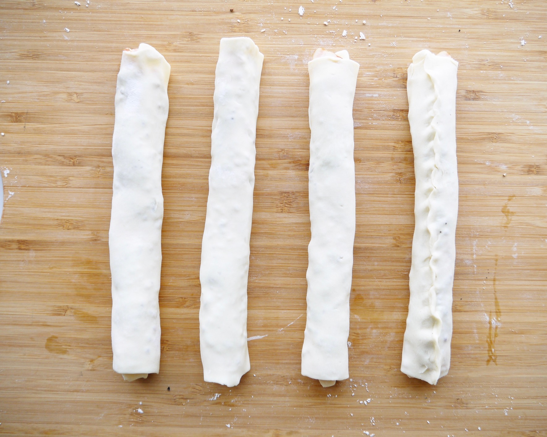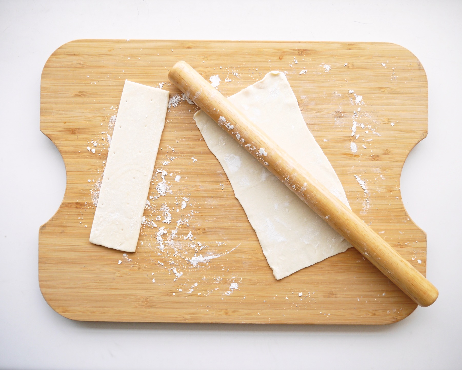冷蔵庫内で半解凍したパイシートを縦長にカットし、打ち粉(分量外)をした上でめん棒で細長い長方形に伸ばす。