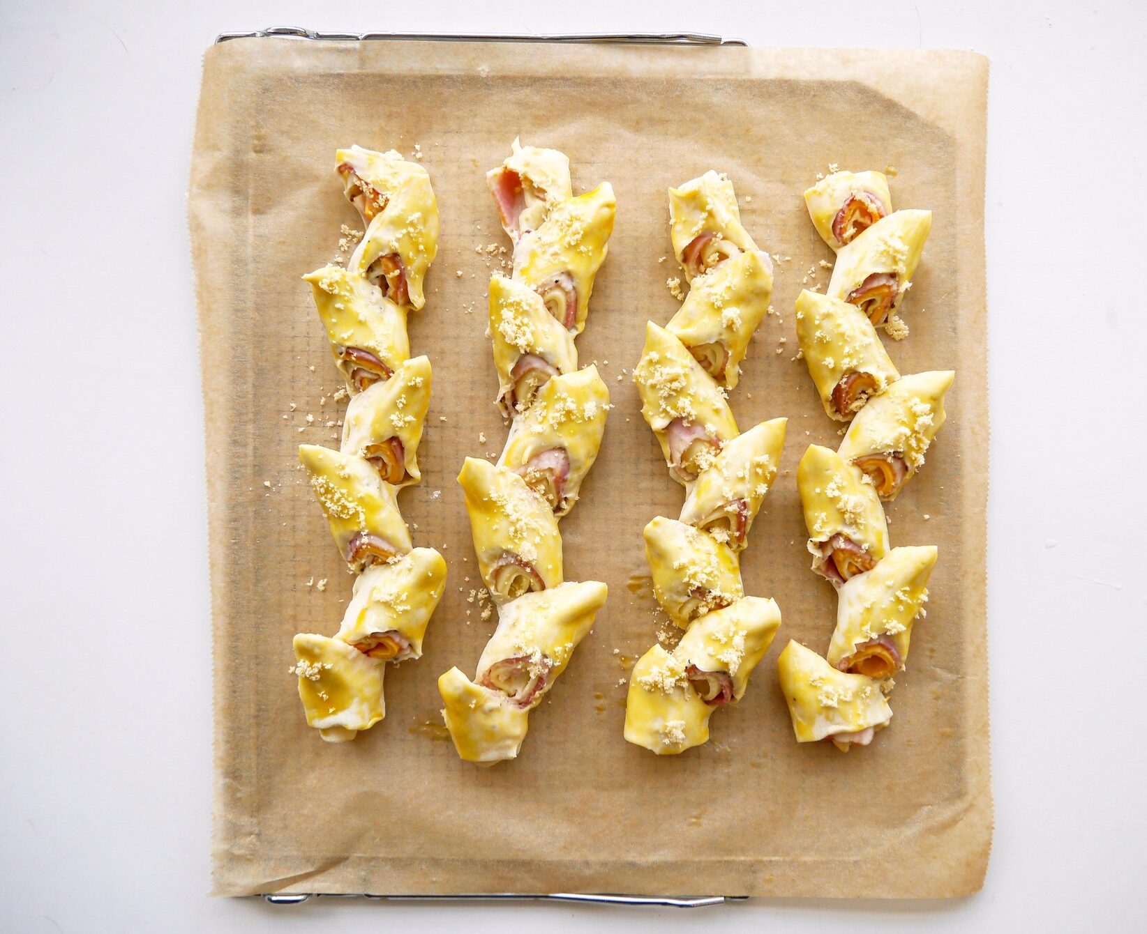 焼き網を取り出し、オーブンシートを敷いて、閉じた面を下にして並べる。