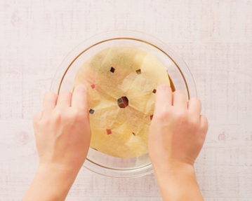水大さじ3(分量外)をふり、ふんわりとラップをして600Wのレンジで7分30秒~8分加熱する。