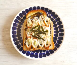 トースターから取り出し、中央に半熟卵を乗せてブラックペッパーをかける。仕上げにお好みでおうちパスタをかけていただく。