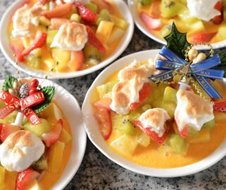 (6)の上に(2)のメレンゲをふんわりと乗せ、目盛「5」でメレンゲにほんのり焼き色がつくまで2~3分ほど焼く。