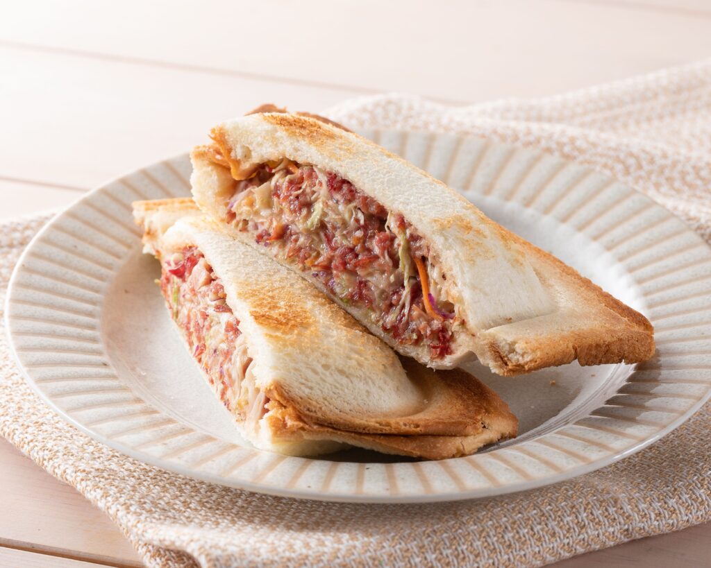 焼き上がったらミトン等を使用してホットサンドを取り出し、お好みの大きさに切り分ける。