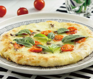 モッツァレラチーズ、アンチョビ、ミニトマトをのせ、オリーブオイルを回しかけ、グリルパン(浅)でふたをする。280℃で7分焼く。