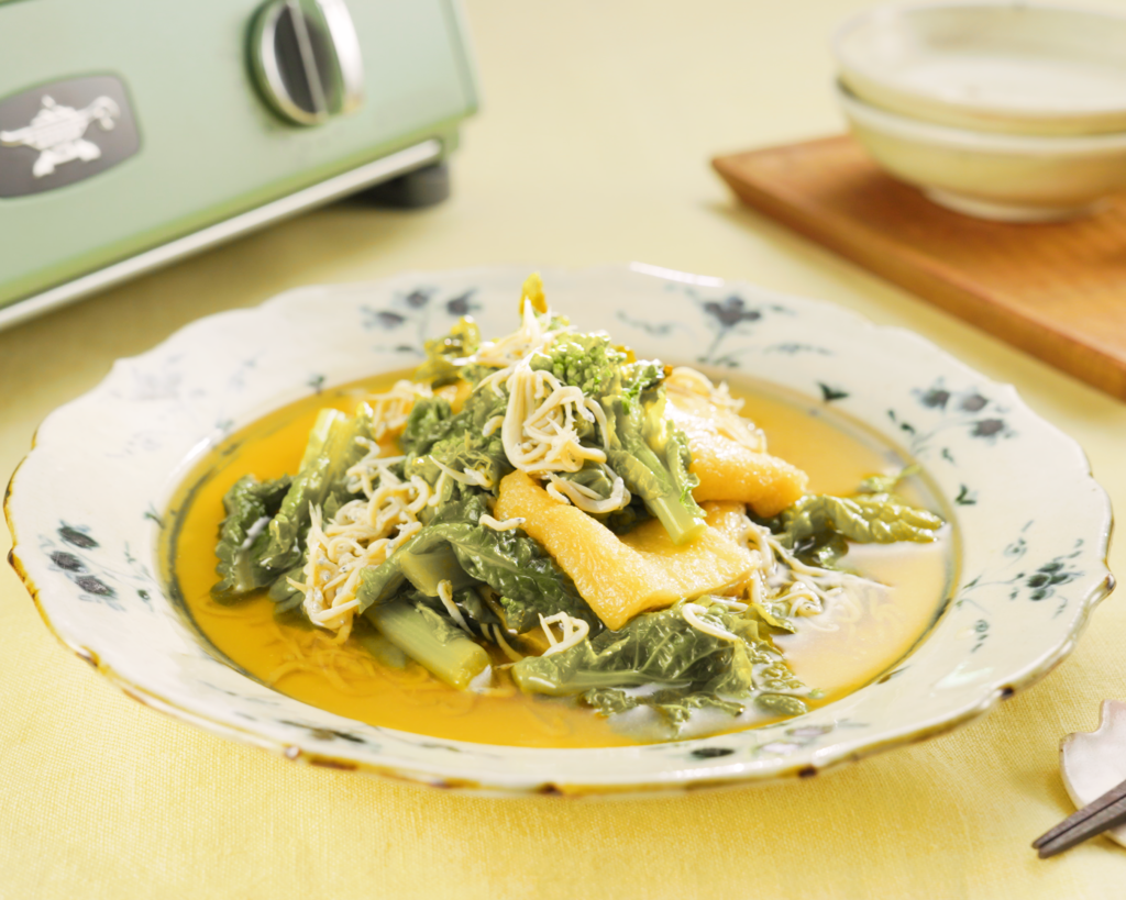 グリルパン(深)にAを合わせて混ぜ、しらす、油揚げをひたし、その上に菜の花を並べる。グリルパン(浅)でふたをして、180℃で9分加熱する。