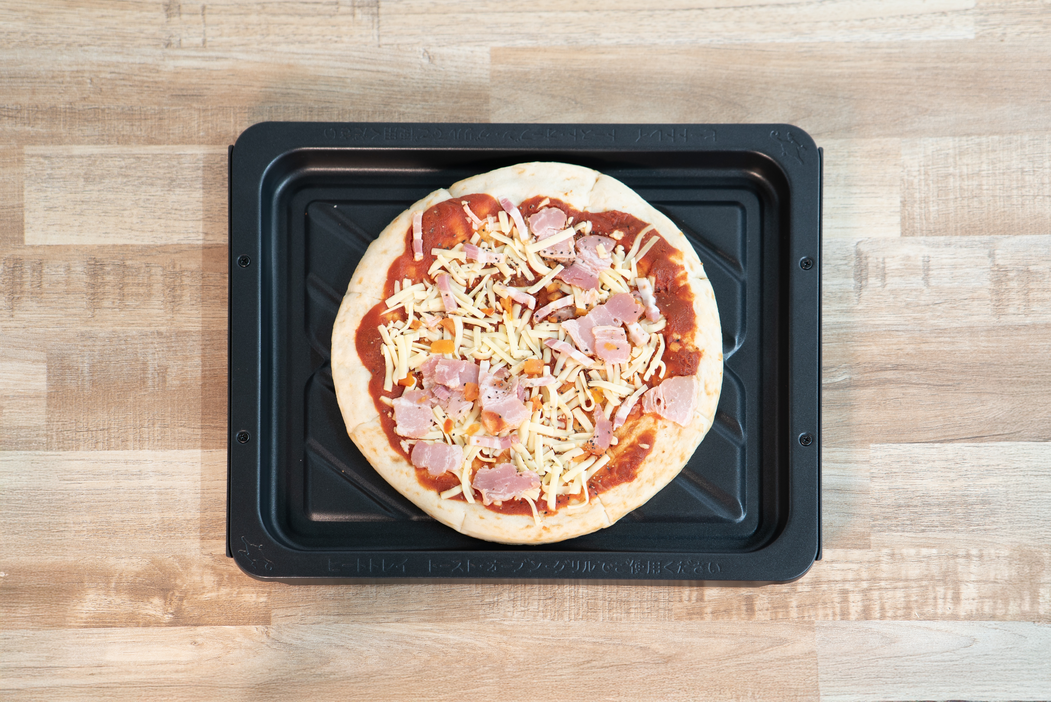 包装や容器を取りはずし、ヒートトレイに直接市販のピザをのせる。