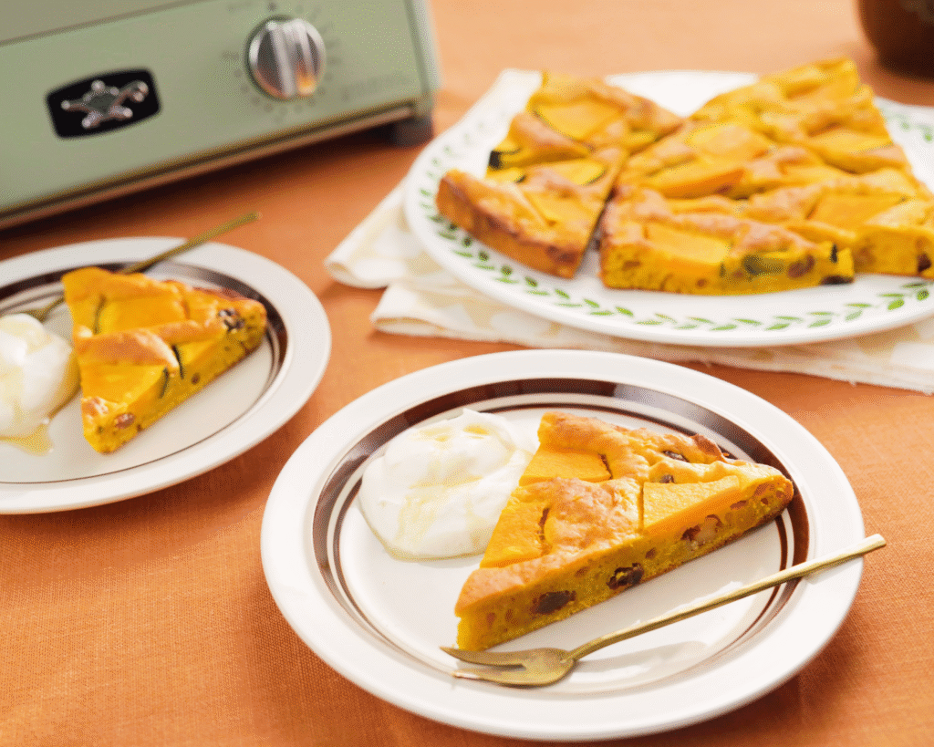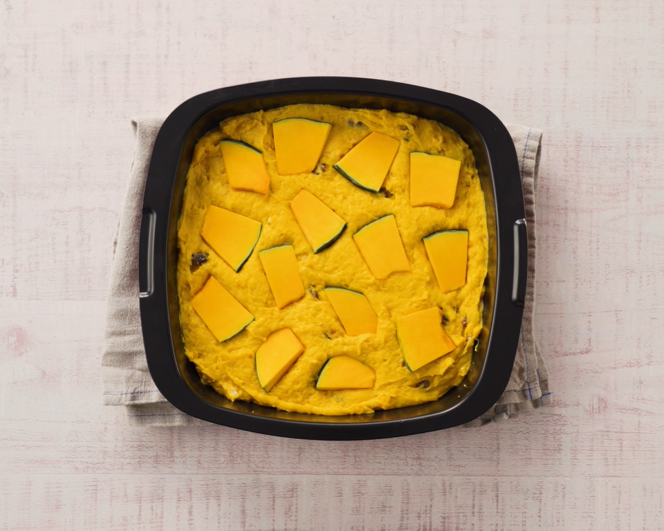 グリルパン(浅)でふたをして、トースターに入れ、200℃で8~10分、かぼちゃがやわらかくなるまで加熱する。