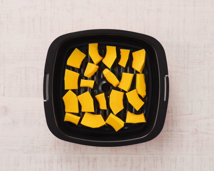 グリルパン(深)に水100ml(分量外)を入れ、グリルプレートを入れてその上に皮をむいたかぼちゃを並べる。