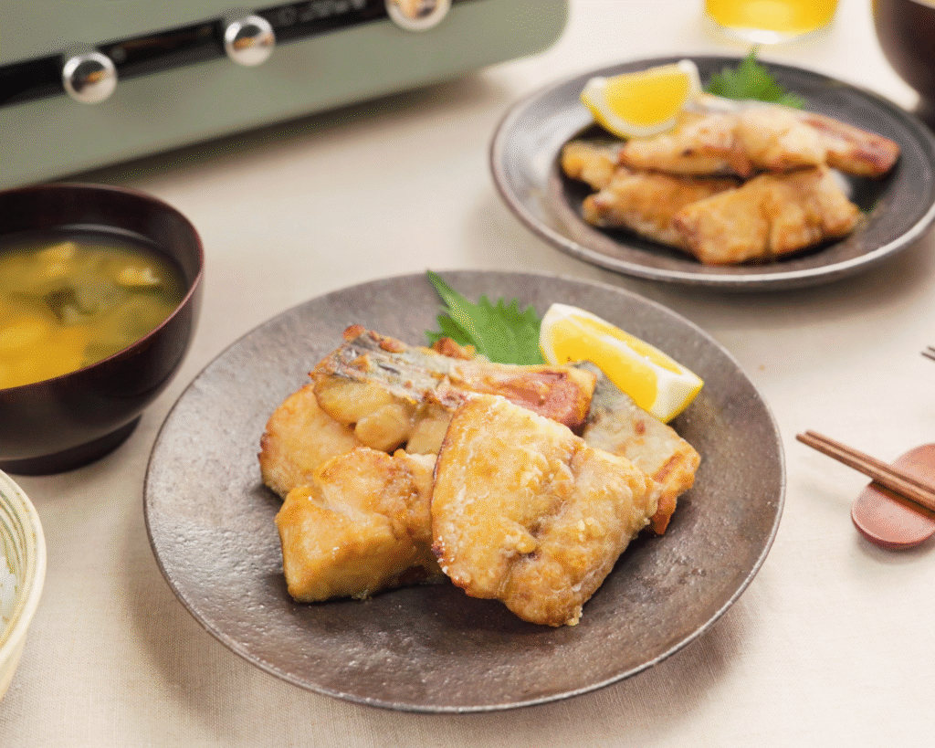 さばの汁けをペーパータオルでおさえ、片栗粉をまぶす。