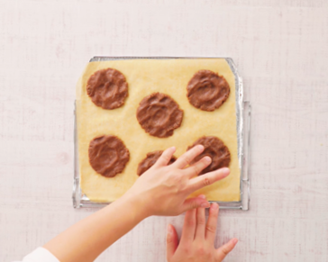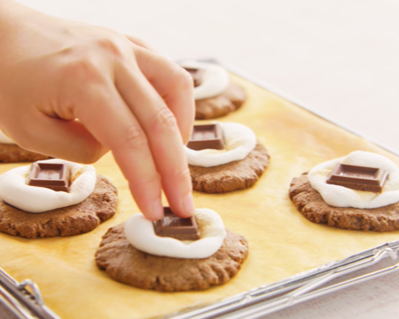 取り出して熱いうちにチョコレートをマシュマロの上にのせ、軽く押して密着させる。そのまま冷ます。