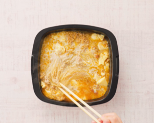 豚ひき肉をのせ、豆腐をちぎってのせる。