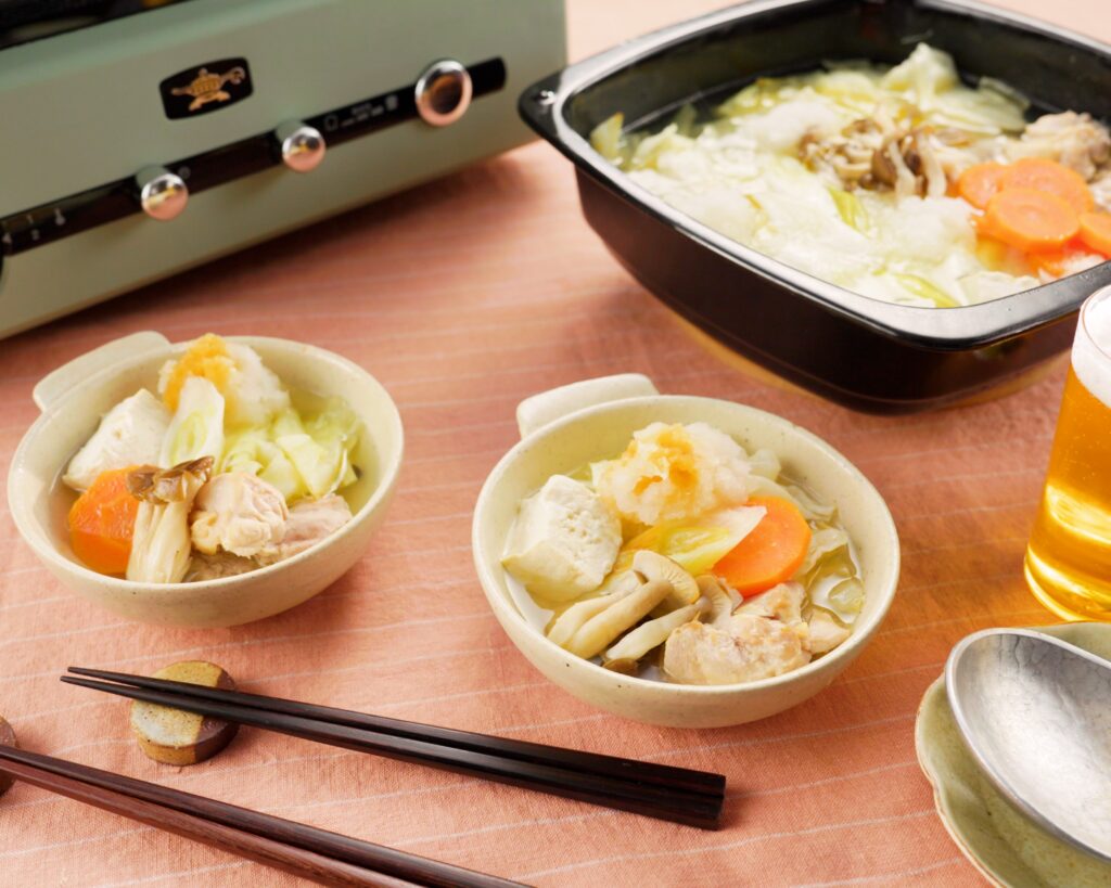 取り分け、お好みで残り半量の大根おろしやポン酢しょうゆを添えて食べる。
