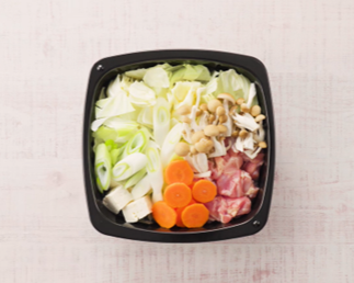 キャベツをしき、空いたところに鶏肉、長ねぎ、にんじん、しめじ、豆腐を加える。