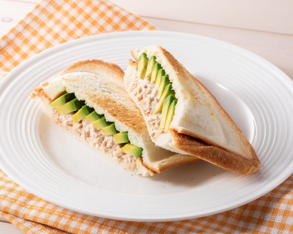 下プレートに食パンを1枚おき、2を塗り広げその上にアボカドを並べる。